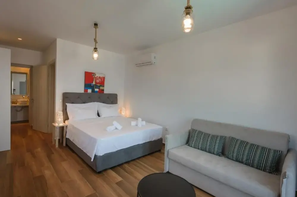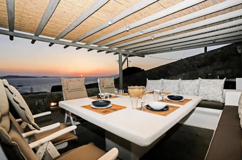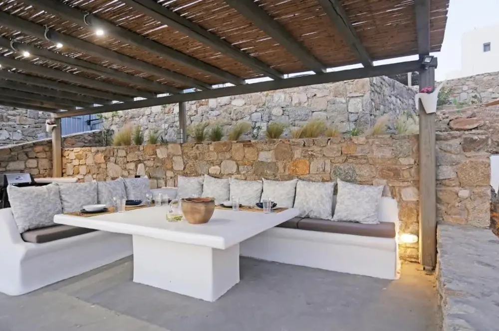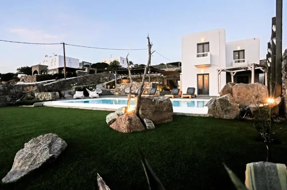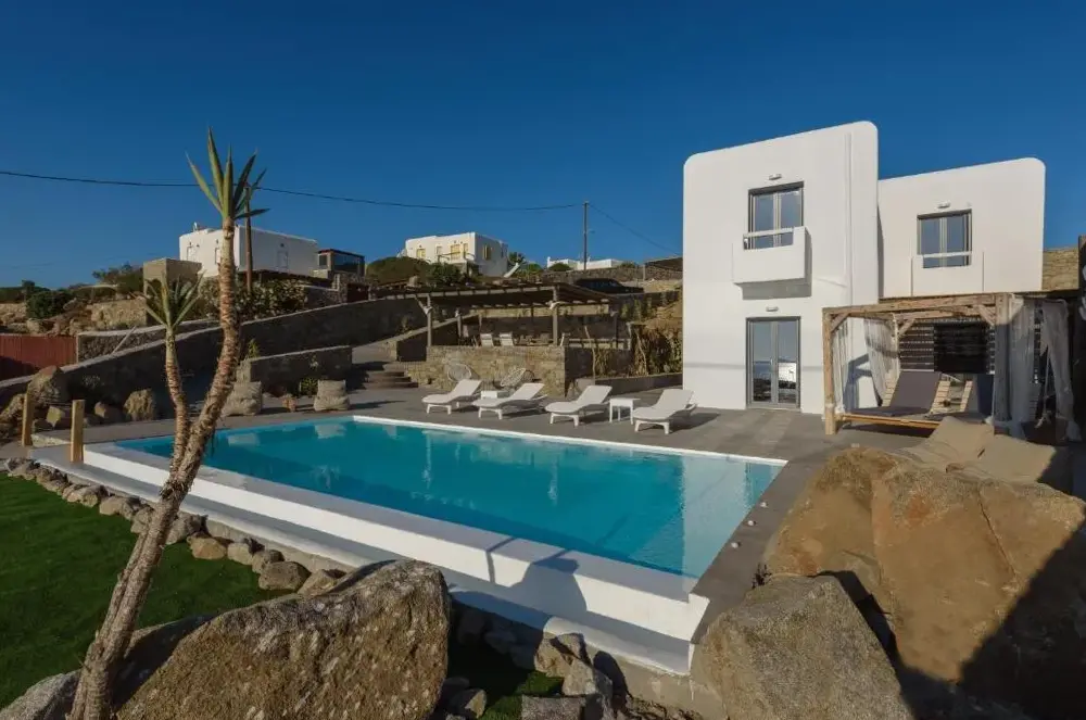 Elegant Accommodations: Cycladic Breeze Villa with Private Pool in Agios Ioannis offers a spacious villa with four bedrooms and four bathrooms. Guests enjoy a private pool, terrace, and garden, complemented by free WiFi. Comfortable Amenities: The property features air-conditioning, a fully equipped kitchen, washing machine, and a dining area. Additional amenities include a barbecue, outdoor furniture, and a work desk. Convenient Location: Located 3.7 mi from Mykonos Airport, the villa is an 8-minute walk from Glyfadi Beach. Nearby attractions include Mykonos Windmills and Little Venice, each 3.1 mi away.